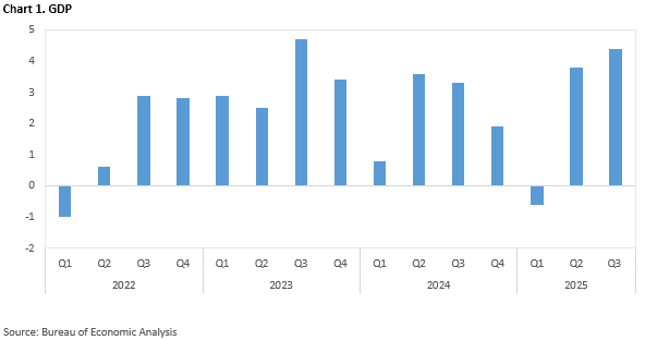 US GDP growth accelerated, with Q3 revised to 4.4% and Q4 tracking near 5.4%, driven by resilient consumption, exports, and investment. Inflation remained stable and private investment strengthened.